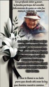 #Defuncion || • Lamentamos comunicar el sensible fallecimiento de quien en vida fue doña Amalia Coronel Cancho, el velatorio se lleva acabo en Moquegua. 🕊️ Misa de cuerpo presente: viernes 14 a horas 2pm en la Capilla de Moquegua 🙏 Sepelio: Cementerio general de San Juan Pampa. Rogamos por el descanso eterno de doña Amalia. Atte., Los deudos. Source